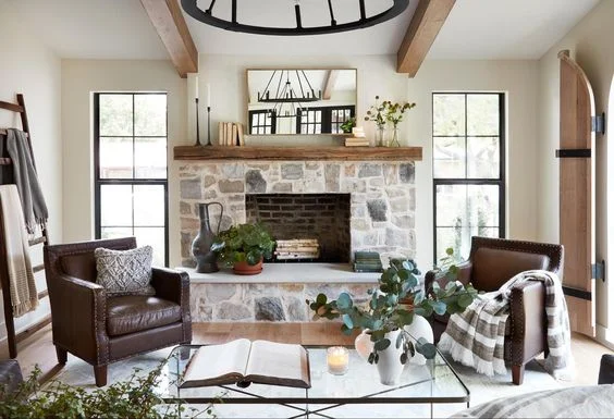 I’d begin by giving the fireplace a makeover. It’s a bit dingy and overly gray-toned. To create more contrast with the log walls around it, I’d cover the stone with more mortar to lighten it and clean it up. The goal would be to create a look similar to this image: