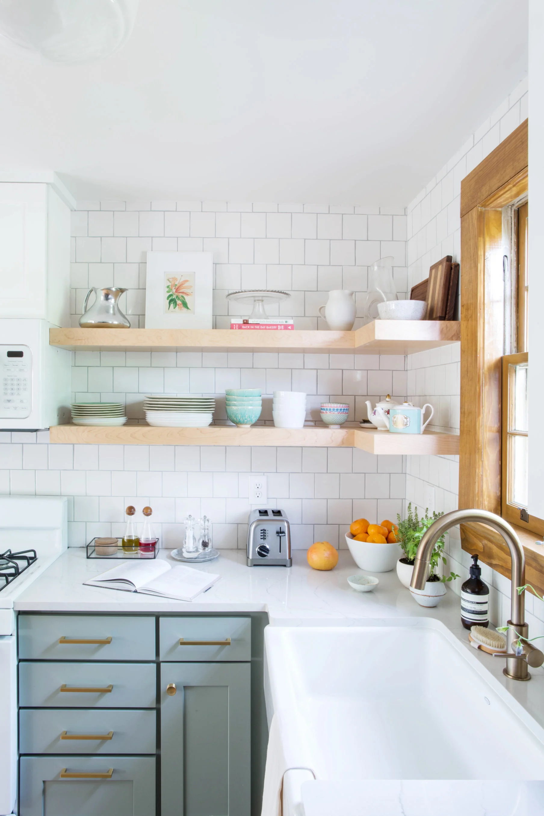 All the wainscoting would get painted white (or be removed) to decrease the amount of wood in this space. I’d overhaul the kitchen completely. I’d choose shaker cabinetry painted a warm, pale gray such as “Smoke Embers” by Benjamin Moore. Instead of upper cabinetry, I’d install open shelving where I’d display handmade ceramic mugs along with plates, glasses and bowls. The counters would be white quartz with a little bit of veining, and the track lighting would be updated to something small, sparkly and modern. The moodboard I posted above shows a possibility for table, dining chairs, and statement chandelier. Hardware would be a combination of matte black and brushed brass. Backsplash would be handmade creamy white ceramic subway tile with white grout. I’d most likely add white roman shades to the windows in this space. I’d like to add original art wherever possible as well!