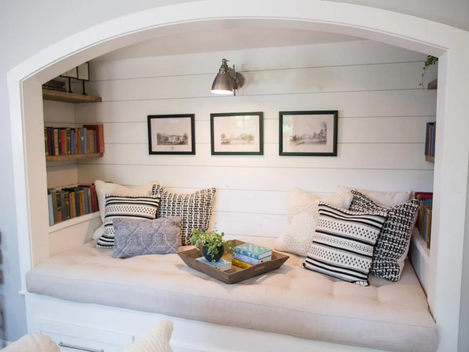The nook opposite the dining area could be a built-in daybed with built-in bookshelves! Or an office space with a built-in desk. Lots of possibilities for customizing the space and making it completely charming and unique. One idea that came to mind right away was to build something similar to this reading nook which was featured in an episode of Fixer Upper: