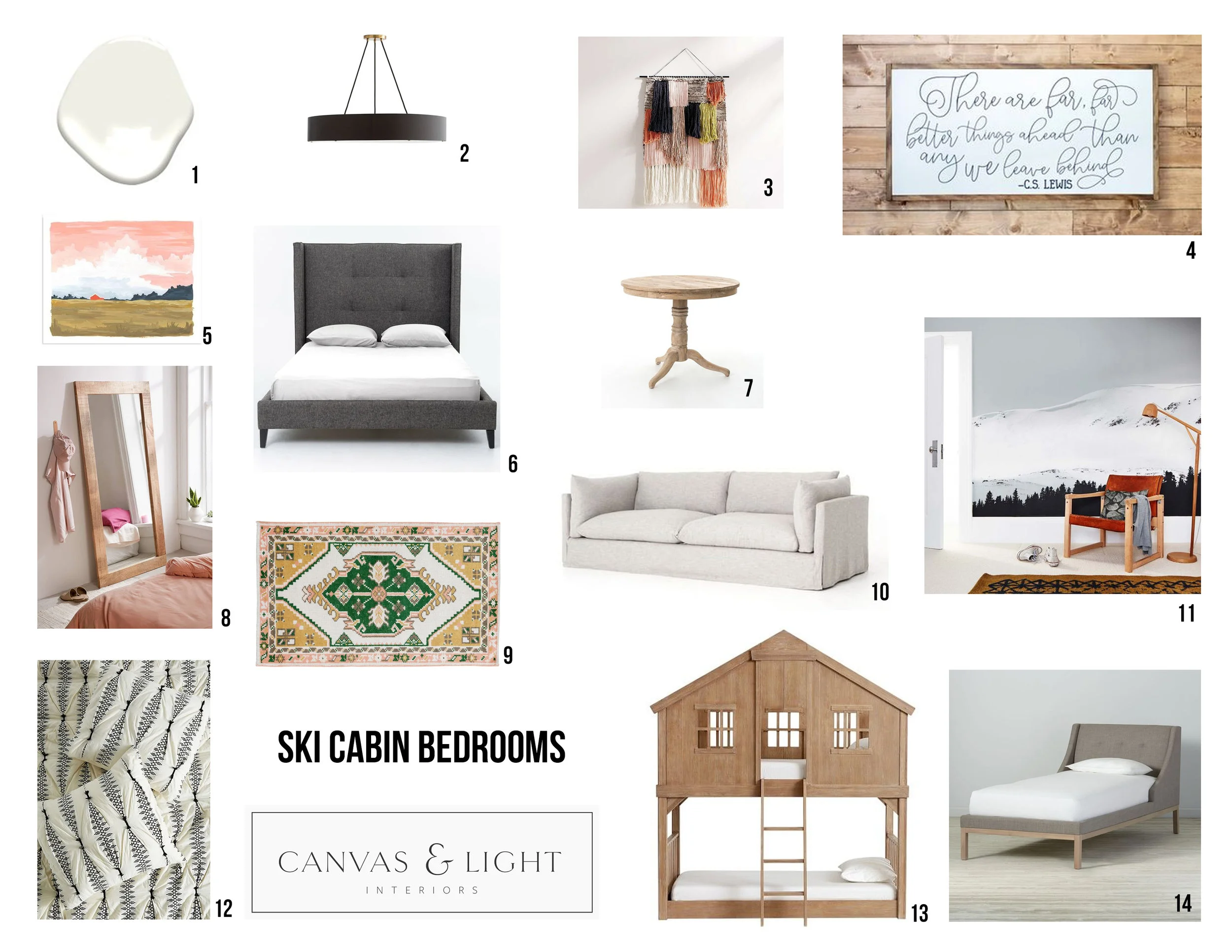 And onto the bedrooms! Here’s a moodboard I created showing some of the furniture, art, lighting, and bedding I’d select to put into the bedrooms (I’d plan on adding a small fourth bedroom in the lower level, if possible):
