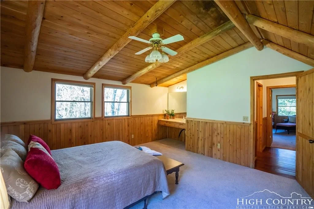 It’s rare that a room has windows and doors along three sides, so that is a feature I immediately noticed and liked. The vaulted ceilings are brought down to human scale with the beams running across at about 8’ high. The fireplace isn’t overbearing, and the staircase is darling! Isn’t it inviting?