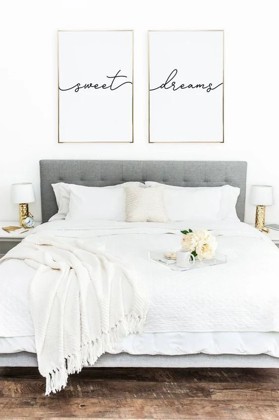 I love the peaceful wooded views! The master bedroom on the first floor has space for a chaise lounge or sofa, and the two upstairs bedrooms have built-in vanities with sinks. As in the kitchen and dining space, I’d paint the bedroom wainscoting white to modernize the space (or remove it completely). I’d add softness via window treatments, and, as seen in the moodboard, the color palette would incorporate whites, blacks, and peachy-pinks, as well as the same grayish-blue-green I mentioned using before. I love the idea of upholstered headboards to offset all the wood in the bedrooms. I’d hang these “sweet dreams” prints above one of the beds.