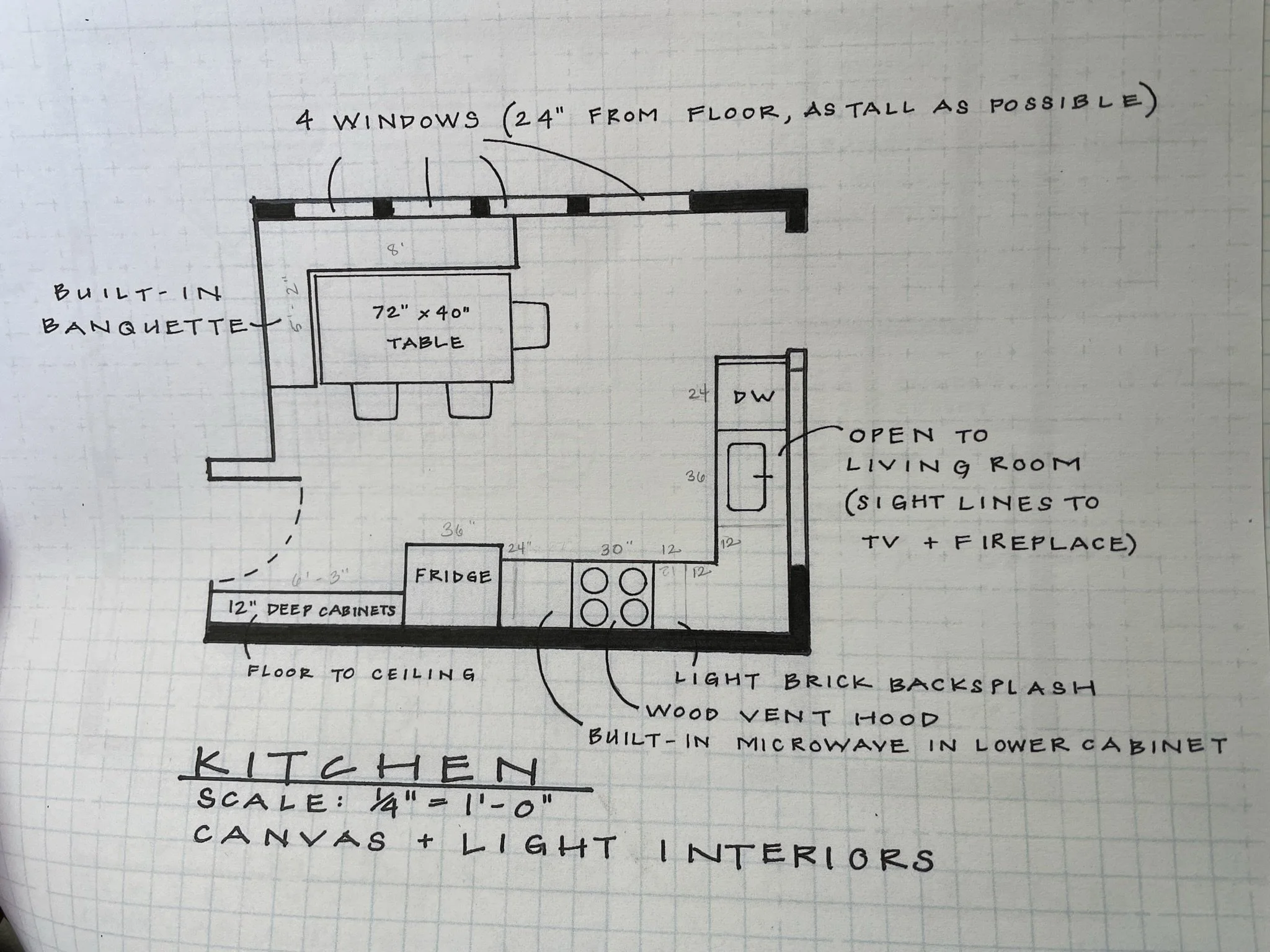 Because the kitchen is on the small side, one corner houses the cabinetry and appliances, and the other corner has a built-in floating bench that I designed, plus a table and three chairs. I wanted to embrace the fact that we were utilizing a basement for this space, so I created a wall of brick to give the illusion of an-always-been-there brick wall, adding texture and charm. Here’s a snapshot of a hand-drawn floor plan I initially created: