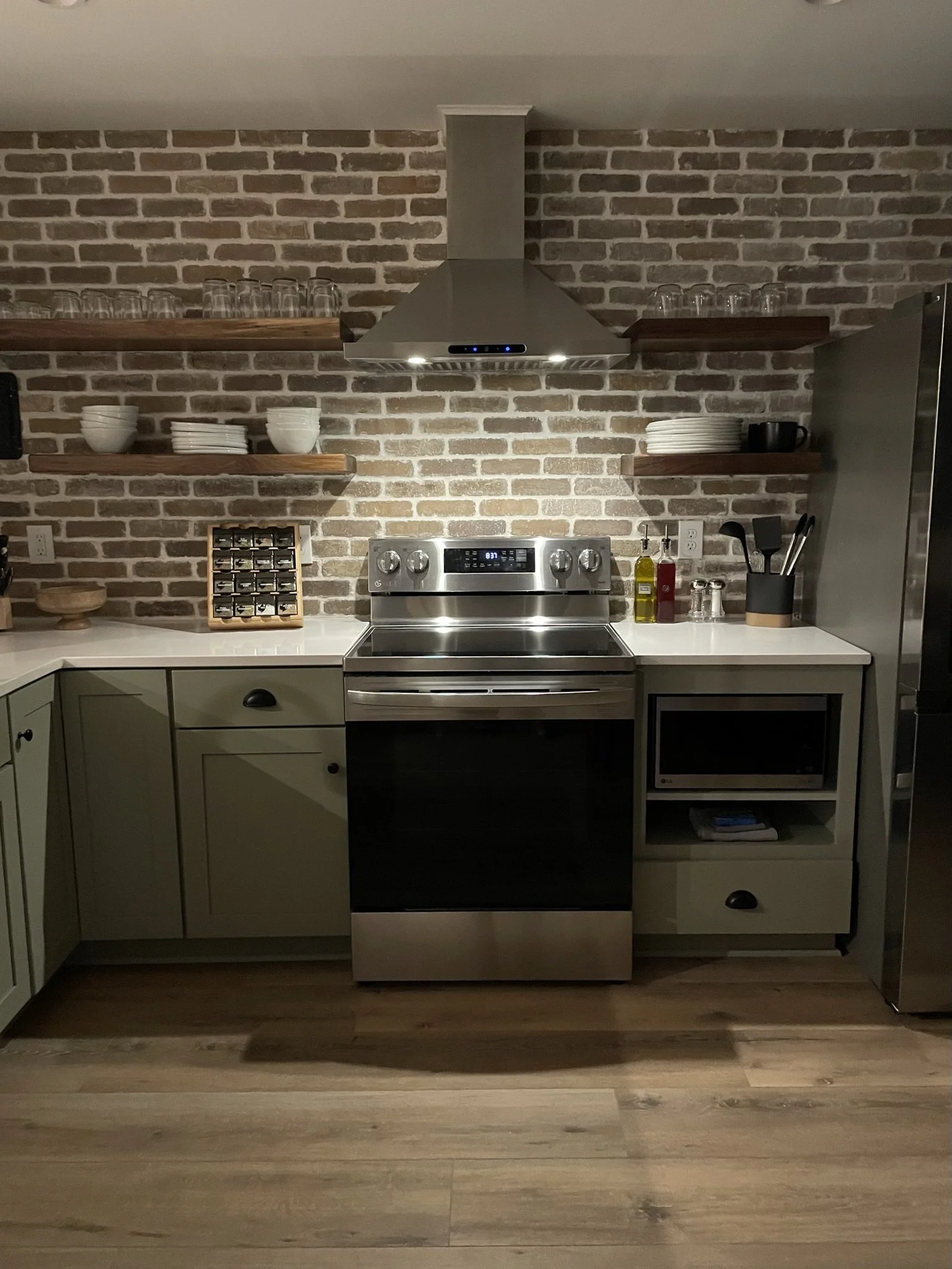 Here are more before and after photos showing the range wall of the kitchen. We had live-edge walnut floating shelves created to store dishes. Not only did this add beauty and a touch of nature to the space, but upper cabinets would have made the small space feel smaller. This also allowed me to make the brick wall quite a feature of this kitchen. I chose to have the cabinetry painted a gray-green color, and I selected a white quartz for the countertops to keep the space feeling clean and bright. I purposely picked out a deep, single-basin stainless steel sink to hide dirty dishes that guests didn’t feel like looking at!