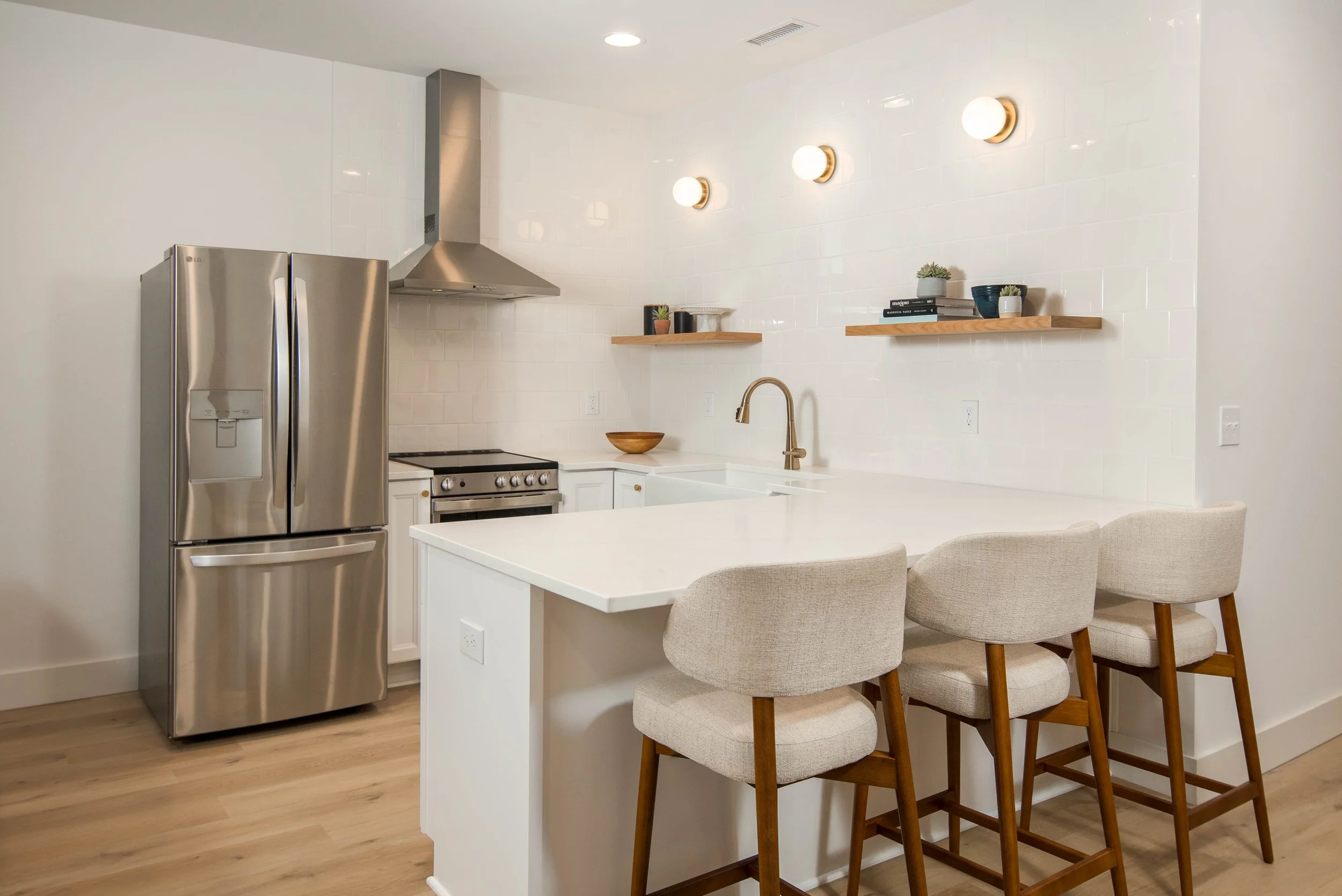 The goal for the Downtown Blowing Rock Airbnb was to create a beautiful, upscale apartment with a touch of rustic style. I loved choosing the placement and style of the windows — this, as well as the natural light and views they capture, completely transformed this space. The built-in reading nook and coffee bar in the living room create an oasis that is perfect for relaxing or working. I designed the bedroom to be calm and luxurious. I oriented all of the bedroom furniture toward the wooded views so guests can face the beauty of the forest. For the kitchen, I selected a brick tile for an entire wall to make this basement walkout as cozy as possible. I designed modern elements for the kitchen like the floating bench and specified rustic elements such as the live-edge shelves for dishes. I created layered lighting with a combination of sconces, table lamps, a chandelier, and recessed lighting, and the mood it sets in this apartment couldn’t be more perfect! To read about the process and see before and after photos, check out this blog post! (If you are interested in renting this apartment, click here!)